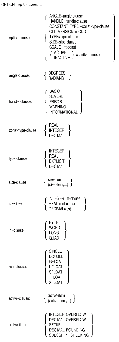 9. Active-clause specifies the decimal rounding, integer and decimal overflow checking, setup, and subscript checking conditions you want in effect for the program module. Active-item specifies the conditions you want to set. Multiple active-items in an OPTION statement must be enclosed in parentheses and separated by commas.