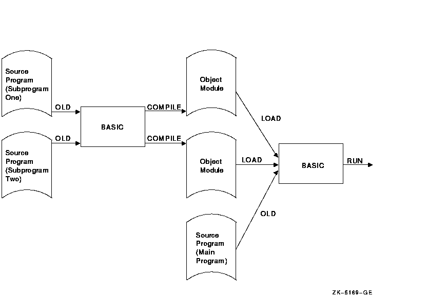 When you run multiple-module programs in the VAX BASIC Environment, only one module is currently compiled. Normally, the currently compiled program is the one you read into memory with the OLD command. However, if a source file contains more than one program module, the last one (the one closest to the end of the source file) is the currently compiled module. In the previous example, MAIN is the currently compiled module.