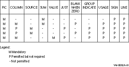 PICTURE clause, and a SOURCE, SUM, or VALUE clause.