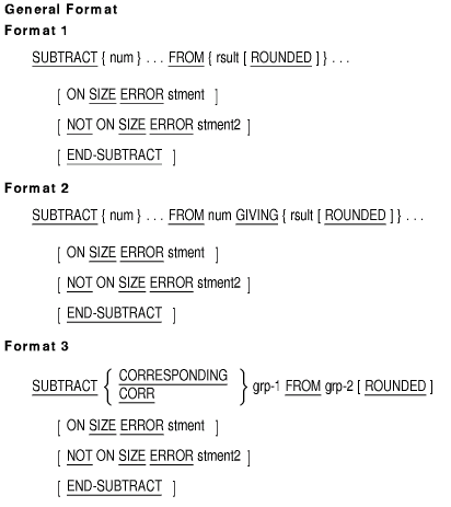 The SUBTRACT statement subtracts one, or the sum of two or more, numeric items from one or more items. It stores the difference in one or more items.