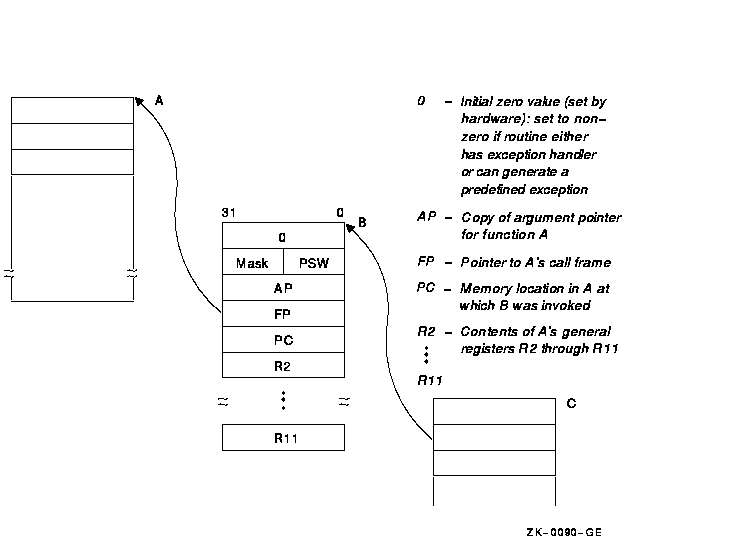 Figure 3-1 shows the call stack and several call frames for VAX processors. Function A calls function B, which calls function C. When a function reaches a return statement or when control reaches the end of the function, the system uses the frame pointer in the call frame of the current function to locate the frame of the previous function. It then removes the call frame of the current function from the stack.