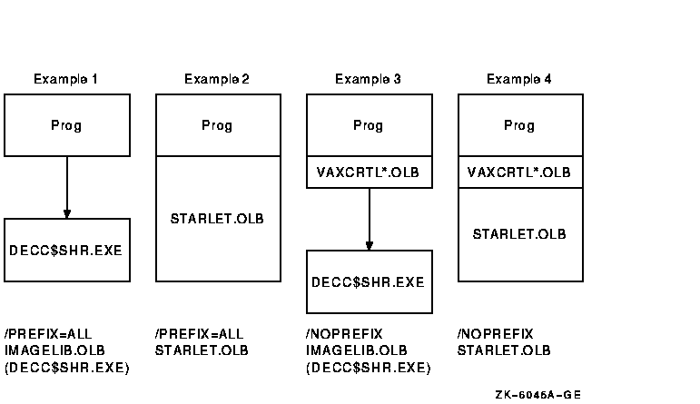$ CC/NOPREFIX_LIBRARY_ENTRIES PROG1 $ LINK PROG1, MYLIB/LIBRARY, ALPHA$LIBRARY:VAXCRTLX.OLB/LIBRARY |