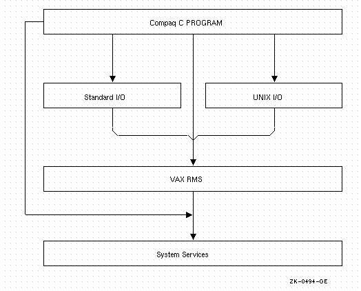 The Compaq C RTL includes the Standard I/O functions that should exist on all C compilers, and also the UNIX I/O functions to maintain compatibility with as many other implementations of C as possible. However, both Standard I/O and UNIX I/O use RMS to access files. To understand how the Standard I/O and UNIX I/O functions manipulate RMS formatted files, learn the fundamentals of RMS. See Section 1.6.1 for more information about Standard I/O and UNIX I/O in relationship to RMS files. For an introduction to RMS, see the Guide to OpenVMS File Applications.