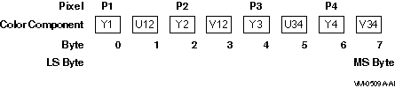 In Figure 7-3, Pn is a pixel, Y is an 8-bit luminance value for a single pixel, U is an 8-bit chrominance value in the YUV color space (applies to 2 pixels), and V is an 8-bit chrominance value in the YUV color space (applies to 2 pixels). This is also known as the Phillips 4:2:2 YUV format.