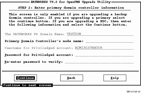 もしドメインを変更していないならば、Continue ボタンを選択し、「Primary Domain Controller Information」画面に進んでください。