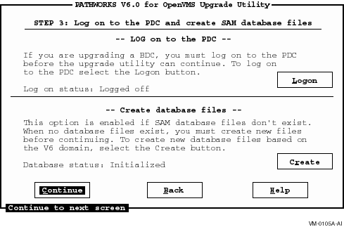 Continue ボタンを選択して5.5.4節、ステップ3:PDCへのログオンとSAMデータベースファイルの作成 へ進んでください。