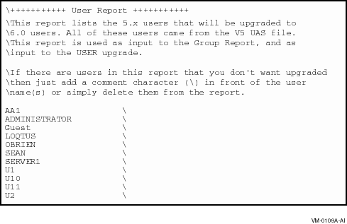 ユーザレポートは PATHWORKS Advanced Server ユーザーにアップグレードされる PATHWORKS LAN Manager ユーザをリストアップします。 もしレポートにアップグレードしたくないユーザがありましたら、ユーザ名の前にバックスラッシュ(\)をタイプするか、あるいは名前をデリートしてください。ユーザレポートの編集の仕方についての詳細は、付録 B、ログファイル中のエラーメッセージに関する修正方法 を参照してください。