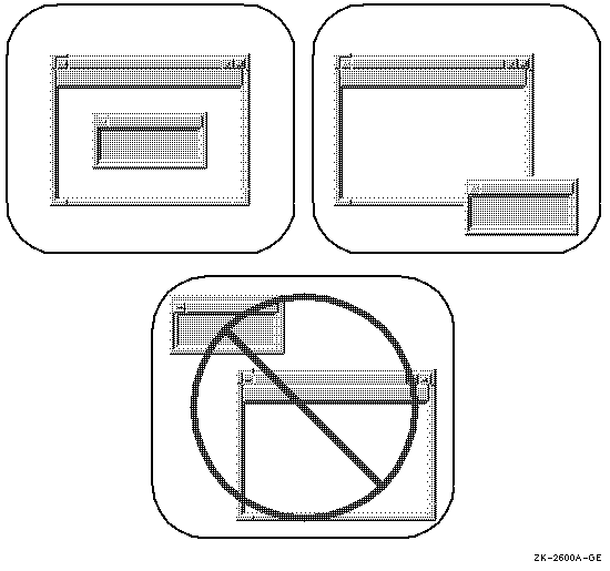 図 1-3に示すように, 画面の左上,すなわち(0,0) にはダイアログ・ボックスを配置しないでください。この位置に配置すると, ユーザの観点からみて,アプリケーションの1次ウィンドウの位置とはほとんど関係を持たない意味のない配置となります。