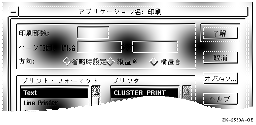1次ダイアログ・ボックス上のプッシュ・ボタンを選択して,2次ダイアログ・ ボックス(ネストしたダイアログ・ボックス)を起動します。1つの2 次ダイアログ・ボックスしか起動しない場合は,プッシュ・ボタンのラベルに「オプション... 」を使用します。図 1-4に例を示します。