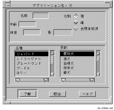 ダイアログ・ボックスの特徴はすべてDECwindows Motifツールキットによって与えられています。 つまり,ダイアログ・ボックスがBulletinBoard またはFormウィジェットの サブクラスである限り,2次ウィンドウを親によって最小化したり復元したりするためのコーディングを行う必要はありません。