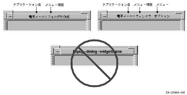 図 1-9には不適切なタイトル例も示しています。 この例では不適切なタイトルとしてウィジェット名を使用しています。 ウィジェット名はユーザにとって何の意味もありません。したがってダイアログ・ ボックスのタイトルには使用するべきではありません。