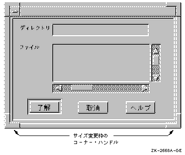 必要と思われる場合は,情報を入力する方法として制御ボタン類(ラジオ・ ボタンやリスト・ボックスなど)を選択することも,テキスト入力フィールドに直接入力することもできるように設定します。 たとえば,図 1-37はユーザがテキスト・ フィールド内でサイズをタイプ入力するか, あるいはプッシュ・ボタンを選択することによってウィンドウのサイズを変更するダイアログ・ ボックスです。