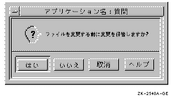 アプリケーション・モード付きのダイアログ・ボックスは,アプリケーションのどのウィンドウに対する処理も禁止します。 たとえば,アプリケーションのメニューの項目から「終了」を選ぶとフル・ アプリケーション・ モード付きダイアログ・ボックスが現われ,終了する前にファイルを保管したいかどうかユーザに質問します。 ユーザはこの質問に答えるまで, このアプリケーションのどの部分とも会話することができません。