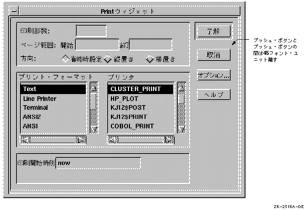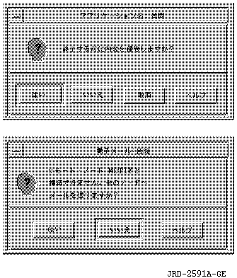 省略時のプッシュ・ボタンとは,ユーザがリターン・キーを押すことによって選択されるボタンです。 ユーザはリターン・キーを押し,作業を続けることができます。 省略時のプッシュ・ボタンを指すと,図 1-16 に示すように,Motifが強調表示を加えて自動的に表示されます。