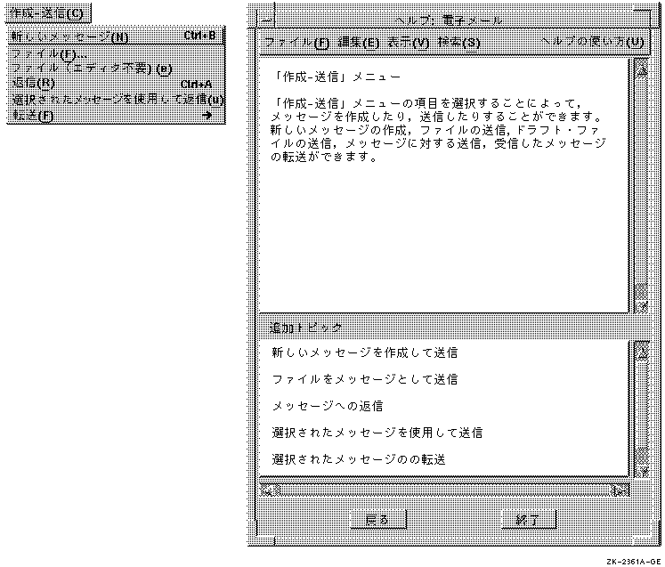 図 5-2は,「作成−送信」メニューを説明するヘルプ・ ウィンドウと追加トピックの例です。追加トピックは「作成−送信」メニューのメニュー項目に対応しており, それぞれのタスク指向の追加トピックは, 各メニュー項目に割り当てることができます。 たとえば,1番目の追加トピック「新しいメッセージを作成して送信」は「新しいメッセージ」メニュー項目と対応しています。