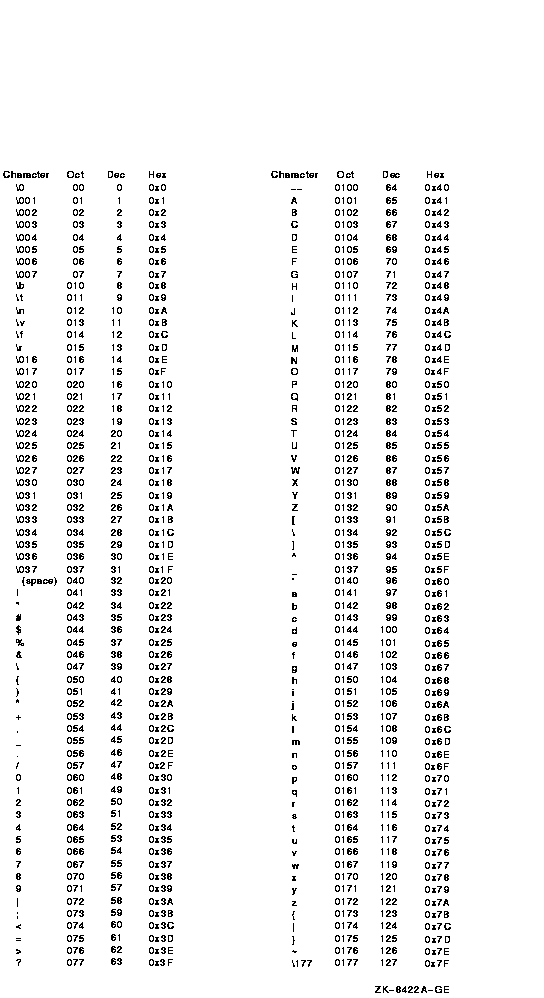 Figure C-1 shows the ASCII character set. Each character's octal,