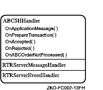 The ABCOrderProcessor server application includes the derived class ABCSHandler for event-driven message and event handling. As Figure 2-5 illustrates, it combines both handlers into one handler class by deriving from both RTRServerEventHandler and RTRServerMessageHandler classes.