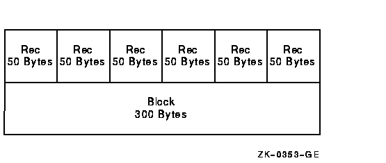 Figure 1-11 shows a block of fixed-length records. Each record has a fixed length of 50 bytes. All six records are contained in a 300-byte block. The records are blocked---that is, grouped together as one entity---to increase processing efficiency; when records are blocked, you can access many of them with one I/O request. The block size should be a multiple of the record size.