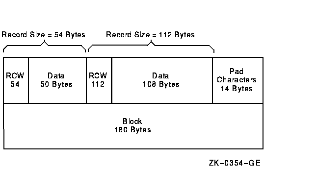The size of a variable-length record is indicated by a record control word (RCW). The RCW consists of four bytes at the beginning of each record. A variable-length record can be a complete block, or several records can be grouped together in a block.