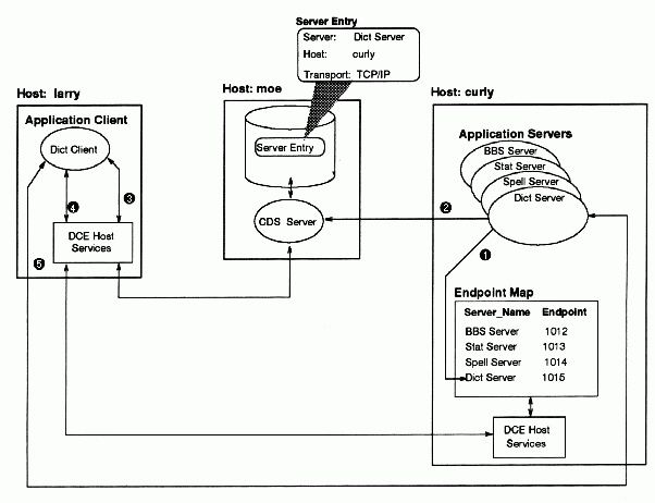 4. The client system's host software then queries the endpoint map on host curly to find the dictionary server's endpoint (port 1015).