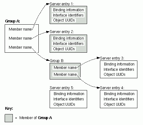 /.:/admin/finance/accts_receivable/laser_13 Group entry name: /.:/admin/finance/payroll_printers /.:/admin/finance/payroll/laser_10 /.:/admin/finance/payroll/laser_11 /.:/admin/finance/payroll/laser_12 /.:/admin/finance/payroll/laser_13 You could temporarily make one department's printers available to another group by adding its group name to the group entry of the other group as shown in the next group entry example. Group entry name: /.:/admin/finance/accts_payable_printers /.:/admin/finance/accts_payable/laser_10 /.:/admin/finance/accts_payable/laser_11 /.:/admin/finance/accts_payable/laser_12 /.:/admin/finance/accts_payable/laser_13 /.:/admin/finance/accts_receivable_printers The configuration in the preceding example means the clients in accounts payable can use the printers in accounts receivable 20% of the time. You could offer a higher percentage of use by adding server entry names rather than the group name. The next group entry example shows a situation where the clients in accounts payable can use the printers in accounts receivable 50% of the time. One caveat; do not try to increase the percentage of use by including a group name multiple times because you'll get an error. Group entry name: /.:/admin/finance/accts_payable_printers /.:/admin/finance/accts_payable/laser_10 /.:/admin/finance/accts_payable/laser_11 /.:/admin/finance/accts_payable/laser_12 /.:/admin/finance/accts_payable/laser_13 /.:/admin/finance/accts_receivable/laser_10 /.:/admin/finance/accts_receivable/laser_11 /.:/admin/finance/accts_receivable/laser_12 /.:/admin/finance/accts_receivable/laser_13 Although application servers can manage their own group entries in CDS, you may find it more convenient (and more straightforward) to manually add, remove, or change server information in a group entry. Like managing server entries, there are several methods for managing group entries in CDS: · Group entry names can be hard coded into an application. You can change group entry information in the source code but you need to recompile and rerun the application before the entry names take effect. · Group entry names can be passed to an application through environment variables or arguments. These are more convenient methods than recompiling but you might need to restart an application to use either method. · Group entry names can be directly managed in CDS by using the DCE control program's rpcgroup object. This manual method does not require recompiling or restarting applications. The next topics discuss how to use the rpcgroup object to manually manage group entries in CDS. More: Creating a New Group Entry in CDS Adding a Member to a Group Entry in CDS Viewing the Members of a Group Entry Importing Binding Information from a Group Entry in CDS Removing Members from a Group Entry in CDS Deleting a Group Entry from CDS