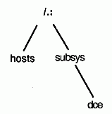 The complete specification of a CDS name, going left to right from the cell root to the entry being named, is called the full name. Each element within a full name is separated by a / (slash) and is called a simple name. For example, suppose the /.:/hosts directory shown in The figure above contains an entry for a host whose simple name is bargle. The CDS full name of that entry is /.:/hosts/bargle. Multiple consecutive slashes are turned into a single slash in a full name.