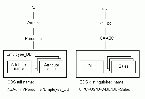 The following figure illustrates this difference in the construction of CDS and GDS names. The CDS full name /.:/Admin/Personnel/Employee_DB is the complete directory specification of an entry with the simple name Employee_DB. Attributes and their values are not a part of the CDS full name. The GDS distinguished name /.../C=US/O=ABC/OU=Sales is a concatenation of attribute types and values, one from each level of a DIT schema.