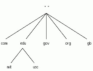 DNS NamesThe DCE naming environment supports the version of DNS that is based on Internet Request for Comments (RFC) 1034 and RFC 1035. Many networks currently use DNS primarily as a name service for host names. The most commonly used implementation of DNS is the Berkeley Internet Naming Domain (BIND). The BIND namespace is a hierarchical tree with its topmost levels under the control of the Network Information Center (NIC). (See OSF DCE Administration Guide - Introduction for information on how to contact the NIC Domain Registrar to register a domain name.) The names directly under the root of the BIND namespace include two-letter codes for countries, such as us and gb, as defined in ISO Standard 3166, "Codes for the Representation of Names of Countries." Other names one level below the root include several generic administrative categories, such as com (commercial), edu (educational), gov (government), and org (other organizations). The owners of these names can grant permission to companies and organizations to create new subordinate names. The following figure shows a sample portion of the BIND namespace. (The double quotes indicate that the root of the namespace has a null name and is not addressable.) Note that, like CDS names, DNS names are not typed; that is, they do not consist of pairs of attribute types and values.