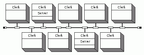 The following figure shows a sample configuration of CDS clerks and servers on a 9-node Local Area Network (LAN). Every node is a clerk, and CDS servers run on two selected nodes.