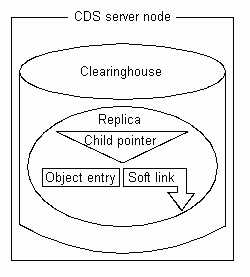 The following figure shows the components of a CDS server node. Every server manages at least one clearinghouse containing directory replicas. A replica can contain object entries, soft links, and