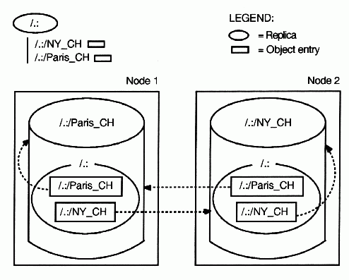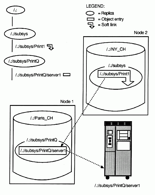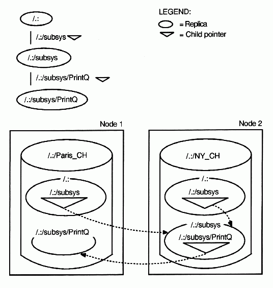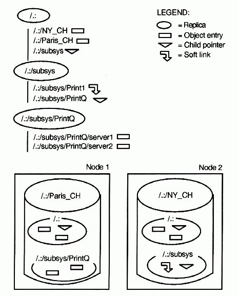 Translating from Names to ResourcesJust as directory names in a logical namespace hierarchy translate to physical replicas in clearinghouses, CDS names translate to physical resources that are used either internally by CDS or by client applications. The attributes of a name are what make the translation possible. This topic describes the relationship between CDS names and the physical resources that they describe. The following figure shows three directories and their contents in a logical namespace, and how replicas of those directories are physically implemented in two clearinghouses. The clearinghouses themselves have CDS names: /.:/Paris_CH on Node 1 and /.:/NY_CH on Node 2. The _CH suffix is a recommended convention for naming clearinghouses. The /.:/Paris_CH clearinghouse contains replicas of the root directory and the /.:/subsys/PrintQ directory. The /.:/NY_CH clearinghouse contains replicas of the root directory and the /.:/subsys directory. Recommended practice is to create at least two replicas of every directory. Therefore, the /.:/subsys and /.:/subsys/PrintQ directories each need to be replicated in at least one other clearinghouse somewhere in the cell.