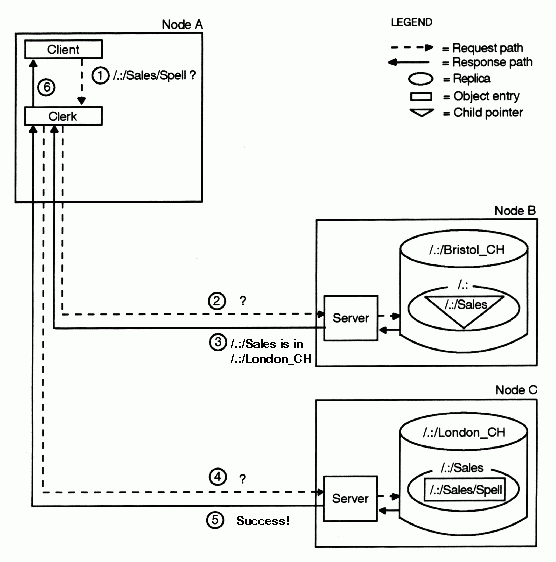 1. On Node A, a spell-checking application requests the network address of the /.:/Sales/Spell server. The clerk does not have that name in its cache, and the only clearinghouse it knows