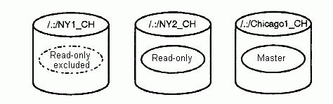In the following example, the replica set of the /.:/eng directory consists of three replicas: the master replica, which is stored in clearinghouse /.:/Chicago1_CH, and the read-only replicas that are stored in clearinghouses /.:/NY1_CH and /.:/NY2_CH.