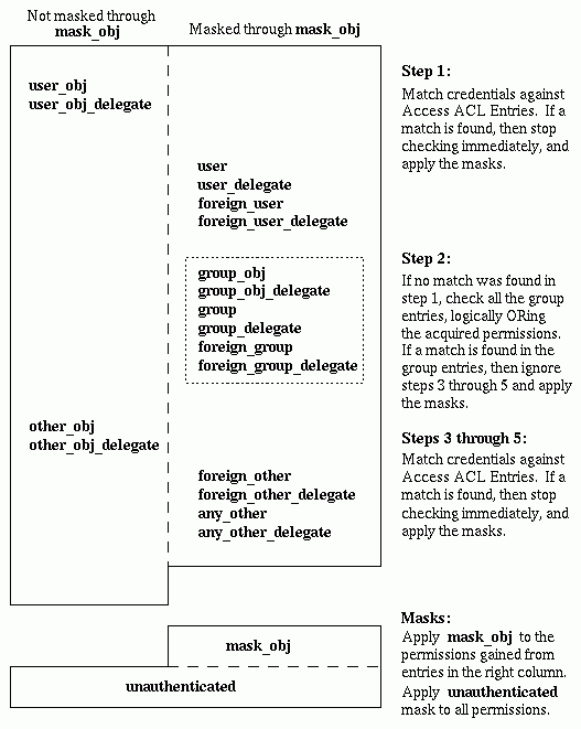 The Checking Sequence for ACL EntriesAn ACL manager reads through a list of ACL entries to find the particular entry that applies to an individual who is trying to perform a particular operation. The ACL manager first looks for a match between the privilege attributes of the principal or process desiring access and the privilege attributes listed in the ACL. When the ACL manager finds a match, it examines the permissions in the matching ACL entry and applies the mask_obj mask to it (unless it is an entry of type user_obj or other_obj) if a mask_obj mask exists. Finally, the ACL manager applies the unauthenticated mask (if it exists) if the principal is not authenticated. If the permissions that result grant the requested access, the manager grants it to the principal. If not, access is denied. Because an ACL manager stops checking the ACL entries when it finds a match, it is important to understand the order in which the ACLs are checked. The following figure shows the order of checking and the masks applied. ACL managers check entries in the following order, with the exception that the initiator principal is not checked against ..._delegate entries. Delegate principals are checked against all entries. 1. First, the ACL manager checks the user ACL entries, in the following order: a. user_obj b. user_obj_delegate c. user d. user_delegate e. foreign_user f. foreign_user_delegate The ACL manager stops all entry checking at the first matching user entry it finds and applies the permissions in the entry. The user entries are checked in order as shown in the previous list from most specific to least specific. 2. If the ACL manager does not find a match in the user entries, it checks all of the following group entries: a. group_obj b. group_obj_delegate c. group d. group_delegate e. foreign_group f. foreign_group_delegate If any group ACL entries match the principal's project list, and the logical OR of permissions from these entries grants access, then access is granted and no further checking is performed. Because principals accrue permissions from all groups listed in the ACL of which they are a member (and for which they are in the project list), all the groups are checked and all the principal's group permissions are logically ORed. The order of group entry checking is not important. See Group Permissions and Project Lists for more information on project lists. 3. If the ACL manager does not find a match between the principal requesting permission and a member of a group in the group entries, it checks the other_obj and other_obj_delegate entries. If the ACL manager finds a match, it stops checking ACL entries. 4. If the ACL manager does not find a match between the principal requesting permission and the other_obj or other_obj_delegate entries, it checks the foreign_other and foreign_other_delegate entries. If the ACL manager finds a match, it stops checking ACL entries. 5. If the ACL manager does not find a match between the principal requesting permission and the foreign_other or foreign_other_delegate entries, it checks the any_other and any_other_delegate entries. If it does not find a match in the any_other or any_other_delegate entries, it denies all access to the object. The final permission is the intersection of the permission of the initiator principal and of each delegate. The following figure shows these steps as they apply to the ACL entries. The two columns distinguish between ACL entries that are not masked by mask_obj and those that are masked by it.