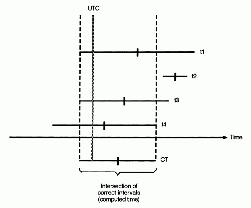 available. Note that, in the following figure, the endpoints of correct time (t1) are further from the computed time midpoint than those of the interval that is declared faulty