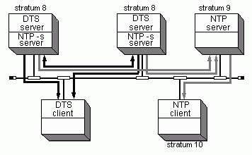 Giving the Time to NTP NodesAny DTS server or clerk that runs the ntpd daemon or the xntpd daemon with the -s option and a special configuration file (ntp.conf) can be configured as an NTP server. For systems running the ntpd daemon, the ntp.conf configuration file must contain the following line: peer /dev/null DTSS 8 -5 local In addition, add -s to the ntpd entry in the file /sbin/init.d/ntpd or, for systems with rc.local, modify the line that starts ntpd accordingly. For systems running the xntpd daemon, the ntp.conf configuration file must contain the following line: peer 127.127.1.8 In addition, add -s to the xntpd entry in the file /sbin/init.d/xntpd or, for systems with rc.local, modify the line that starts xntpd accordingly. In this configuration, NTP never sets the clock. NTP can, however, give the time to other NTP clients. Do not allow loops between DTS and NTP to form. If NTP gives the time to DTS, then DTS gives the time back to the same set of NTP servers, unexpected results can occur. The NTP configuration file is set up to ensure that an NTP server that obtains the time from DTS is a Stratum 8 node. In addition, dts_ntp_provider is prohibited from accepting time from a node at Stratum 8 or higher. A DTS (server) node can give time to an NTP node if the following rules and advisories are observed: · Rule - The ntp.conf file must declare this node at Stratum 8. · Advisory - Multiple nodes in the set can be running ntpd -s or xntpd -s. · Advisory - If any DTS-managed system has a local time source, that system should be used as an NTP -s server. · Advisory - Although this operation can occur on either a DTS server or a DTS client node, a DTS server is preferred. Note: If null providers are used, the rules in Getting the Time from Local NTP Time Sources must also be followed, since null providers running on NTP nodes can bypass the stratum check. The following figure shows two DTS server nodes running ntpd -s and providing time to an NTP subnetwork. The ntp.conf file defines these servers at Stratum 8.