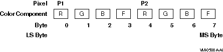 In Figure 7-2, Pn is a pixel, R is the red component, G is the green component, B is the blue component, and F is a filler byte (value not important and undefined). Each pixel is a 32-bit quantity, with 24 bits of significant information. The red, green, and blue components specify the red, green, and blue color values used to display the pixel. There is no associated colormap.