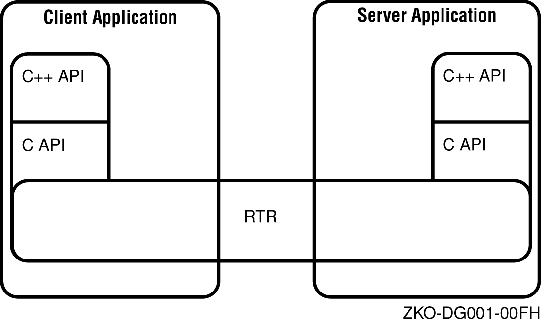 Client applications and server applications can use both the C++ API and the C API or just the C++ API. The C++ API maps RTR data elements, data structures, and C API functionality into the object-oriented design world.