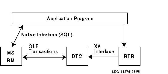 The XA software architecture of RTR provides interoperability with the Distributed Transaction Controller of Microsoft, MS DTC . Thus RTR users can develop application programs that update MS SQL databases, MS MQ, or other Microsoft resource managers under the control of a true distributed transaction. RTR as a distributed transaction manager communicates directly with MS DTC to manage a transaction or perform recovery using the XA protocol. For each standard XA call received from RTR, MS DTC translates it into a corresponding OLE transaction call that SQL Server or MS MQ expects to perform database updates. This is shown in Figure 5-2.