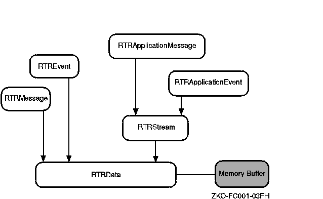 Figure 1-3 illustrates the data classes and their relationships to the RTRData base class and a memory buffer. For example, the base class of RTRStream is RTRData and the base class of RTRApplicationMessage is RTRStream.