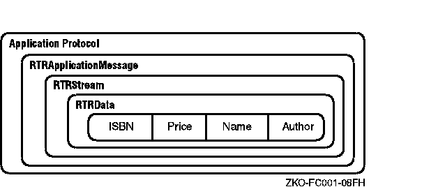 RTR applications need to define an application-level protocol to pass data between client and server. From the point of view of a client or server application, the application protocol is just data. The data object encapsulates the application protocol as shown in Figure 1-4. In this example, a protocol is defined for sending data between a client and server application that processes book orders, as in the book ordering sample application. This data protocol includes fields for ISBN number, book-price, book-name, and author. These fields are contained in a buffer in an RTRData object.
