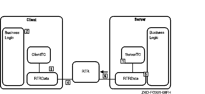 Figure 1-5 illustrates client/server deployment and interaction. The numbered steps represent client logic within the client application and server logic within the server application. For a more detailed description of transactional messaging, see the RTR Application Design Guide.