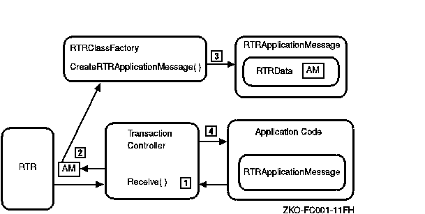 2. The transaction controller determines what kind of message or event is to be received (in this case, an application message) and calls the appropriate method in the registered RTRClassFactory object (for example, CreateRTRApplicationMessage).