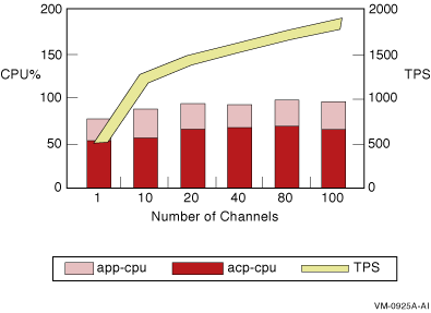 This information is roughly scalable to other CPUs and networks. The material is based on empirical tests run on a relatively busy Ethernet network operating at 700 to 800 Kbps (kilobytes per second). This baseline for the network was based on FTP tests (doing file transfer using a File Transfer Protocol tool) because in a given configuration, network bandwidth is often a limiting factor in performance. For a typical CPU (for example, a Compaq AlphaServer 4100 5/466 4 MB) opening 80 to 100 channels with a small (100 byte) message size, a TPS (transactions per second) rate of 1400 to 1600 is usual.