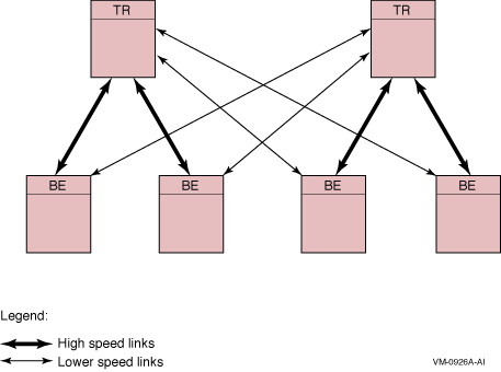 Placement of routers can have a significant effect on your system performance. With connectivity over a wide-area network possible, do not place your routers far from your backends, if possible, and make the links between your routers and backends as high speed as possible. However, recognize that site failover may send transactions across slower-speed links. For example, Figure 2-11 shows high-speed links to local backends, but lower-speed links that will come into use for failover.