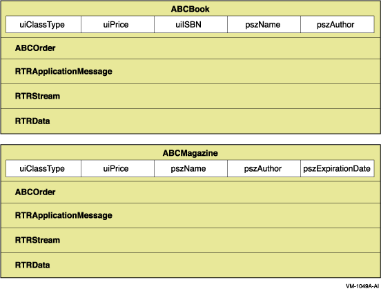 These two classes have been derived from the application's base class, ABCOrder. Book and Magazines are kinds of Orders. The order class tells its derived classes when to serialize their data. When this happens, the data in stored in the RTRData class via the methods of the RTRStream class.