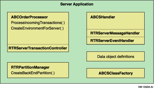 The following figure illustrates the objects within the ABCOrderProcessor server application. Each of the four server classes derives from the associated base classes.