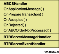The ABCOrderProcessor server application includes the derived class ABCSHandler for event-driven message and event handling. As Figure 2-5 illustrates, it combines both handlers into one handler class by deriving from both RTRServerEventHandler and RTRServerMessageHandler classes.