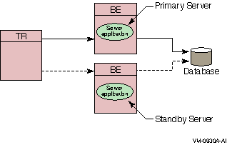The standby server remains idle while the RTR primary backend server performs its work, accepting transactions and updating the database. When the primary server fails, the standby server takes over, recovers any in-progress transactions, updates the database, and communicates with clients until the primary server returns. There can be many instances of a standby server. Activation of the standby server is transparent to the user.