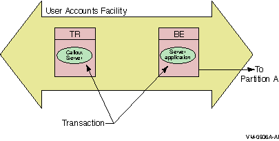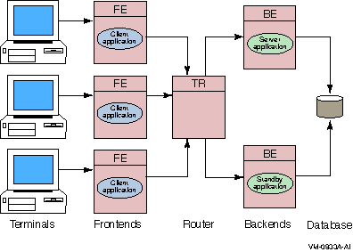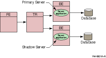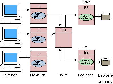 With transactional shadowing, there is no requirement that hardware, the data store, or the operating system at different sites be the same. You could, for example, have one site running OpenVMS and another running Windows NT; the RTR transactional commit process would be the same at each site. Because the database resides at both sites, either backend can have an outage and all transactions will still be processed and recovered.